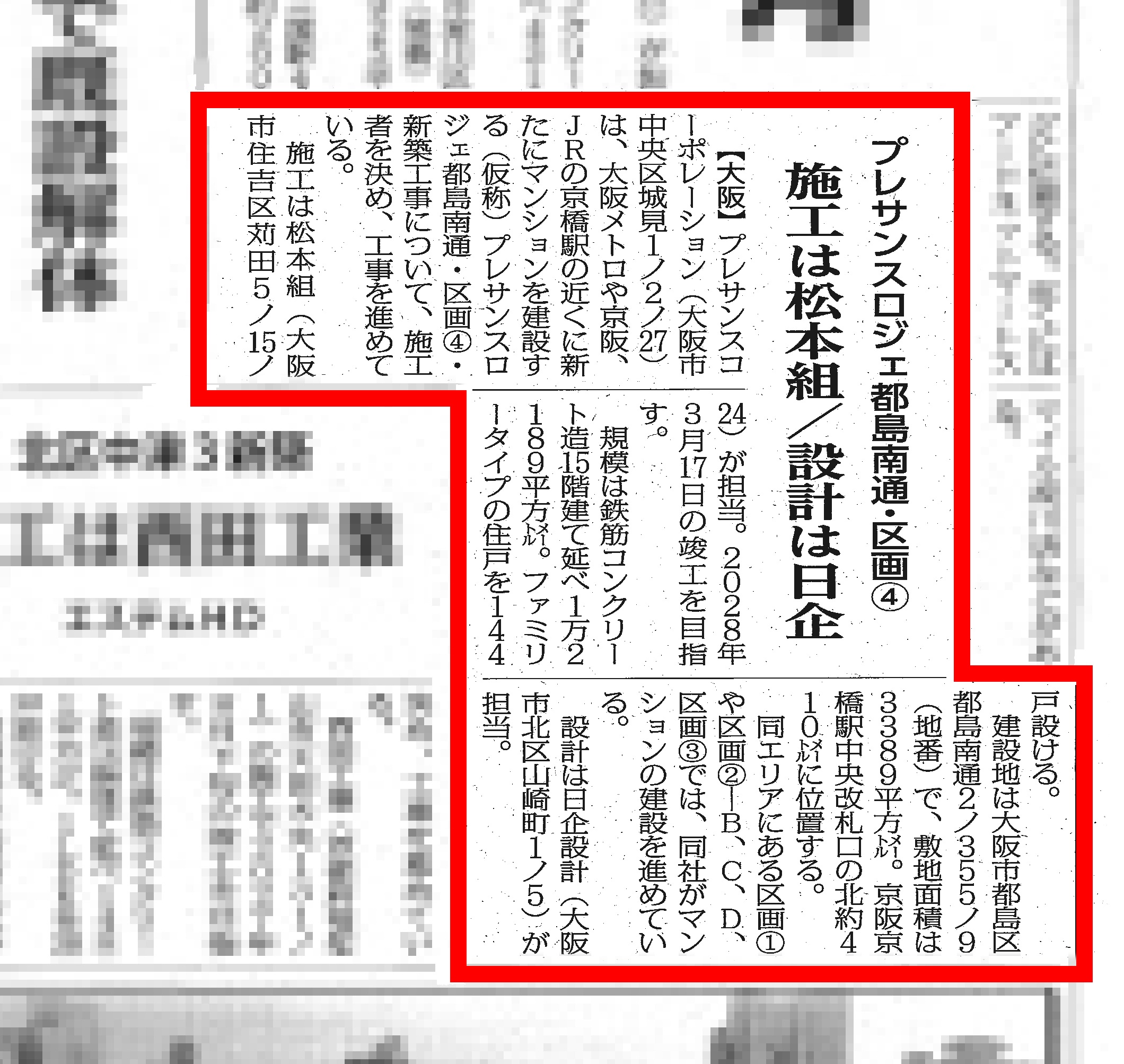 (仮称)プレサンスロジェ都島南通<区画4> 新築工事が掲載されました。